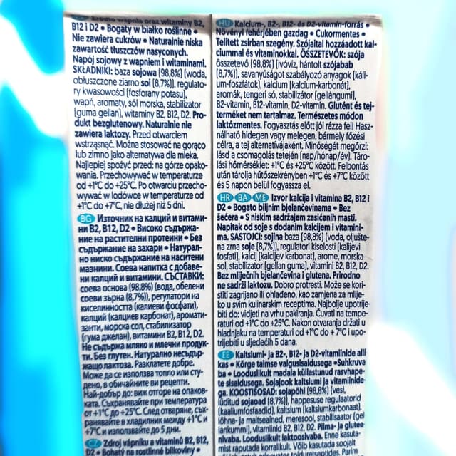 INGREDIENTS: soybean base (98.8% ] [water, hulled soya beans (8.7%]), acidity regulators [potassium phosphates]. calcium, aromas, sea salt, stabilizer (gellan gum), vitamins B2, B12, D2.
