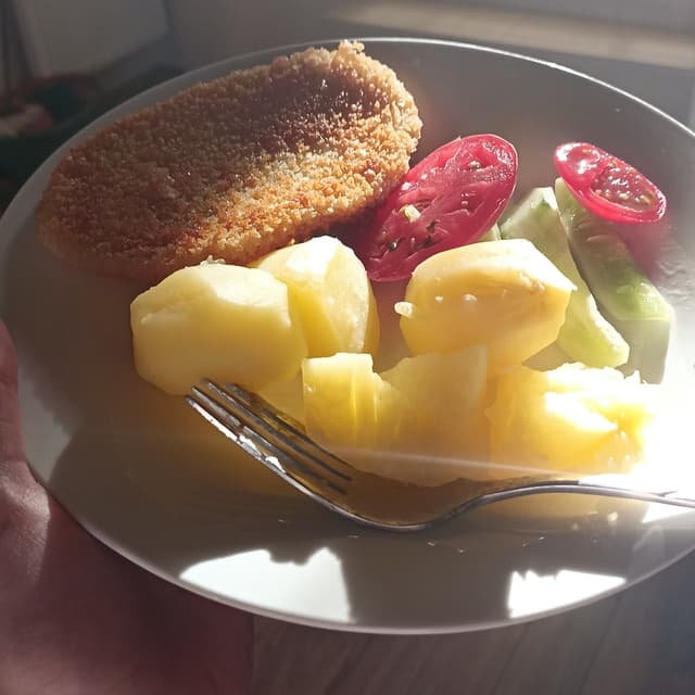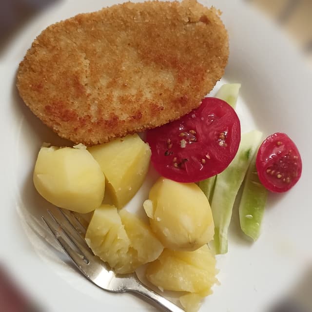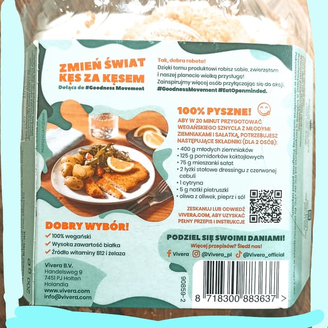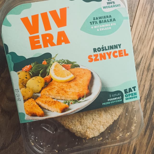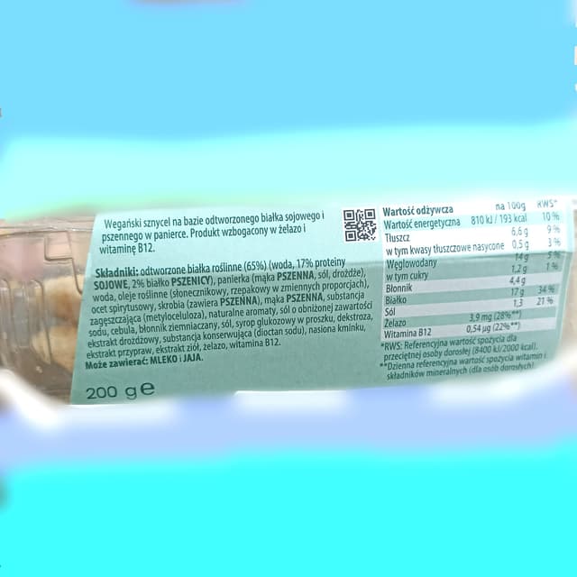 {In summary: Vegan schnitzel based on reconstituted soy and wheat protein in coating. Product enriched with iron and vitamin B12.}