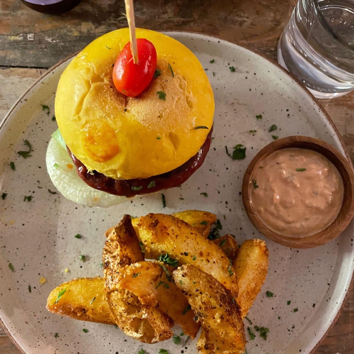 Delicious and original smoked jackfruit burger with caramelised onions, lattuce and tomatoes. Delicious turmeric bread. Must try! Friendly staff. Wide veg drinks offer.