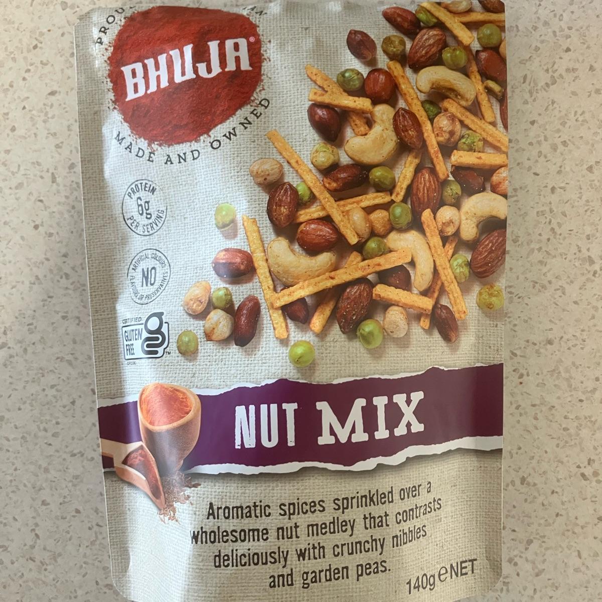 Photo 1: Plastic packaging with the text “Bhuja Nut Mix: Aromatic spices sprinkled over a wholesome nut medley that contrasts deliciously with crunchy nibbles and garden peas.” Different labels say “Proudly Australian Made and Owned. Protein 6g per serving. No Artificial Colours, Flavours or Preservatives. Certified Gluten Free.”