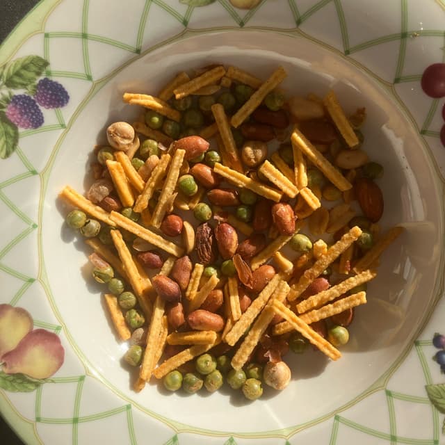 Photo 2: A bowl of trail mix with assorted roasted nuts, chickpeas, green peas and noodles.