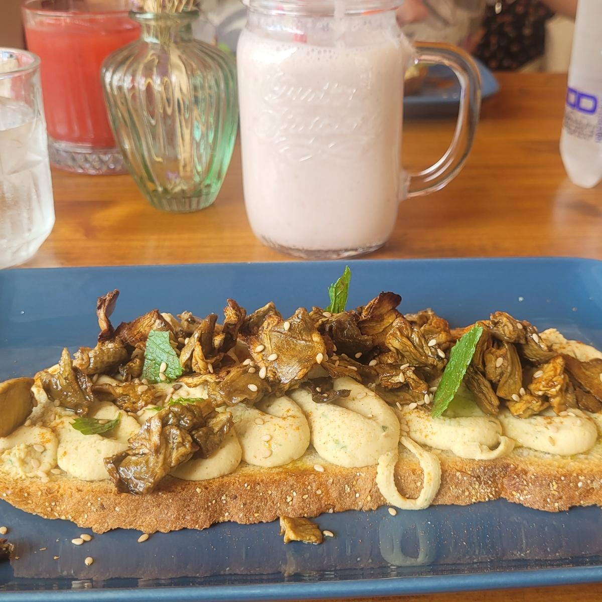 Una bella fetta di pane tostato con un buon hummus delicato alla paprika e melanzane al forno. La menta da una fragranza originale. Il locale è molto carino. Varie opzioni vegetali nei drink, meno nel cibo, spero le aumentino perché è un ottimo posto per il brunch