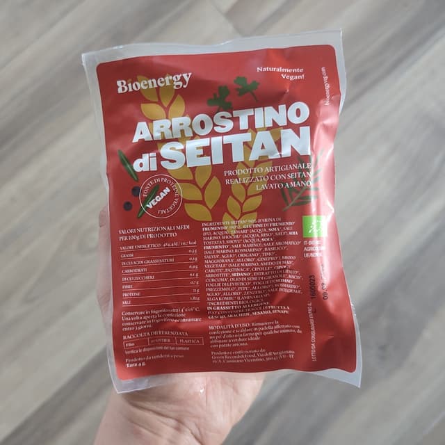 È una specie di rolatina di seitan (all'interno ha solo delle spezie) chiusa con una retina per arrosti.