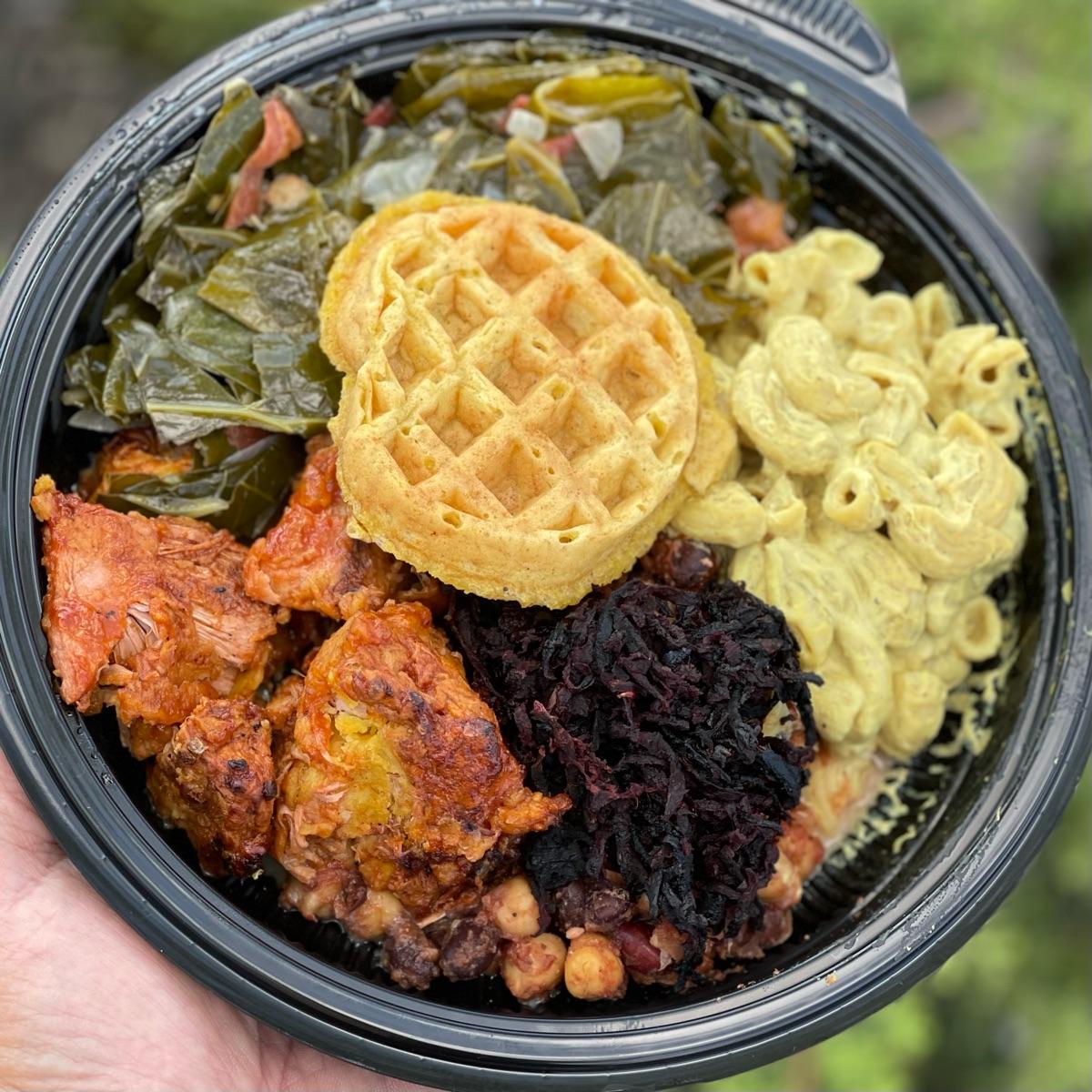 This dish was amazing! Full of variety and flavor, it consisted of: 3 C's Mac & Cheeze, Coconut Collard Greens, BBQ Jackfruit Nugget, Smokey Apple Baked Beans, Beet Brisket, and Waffle.