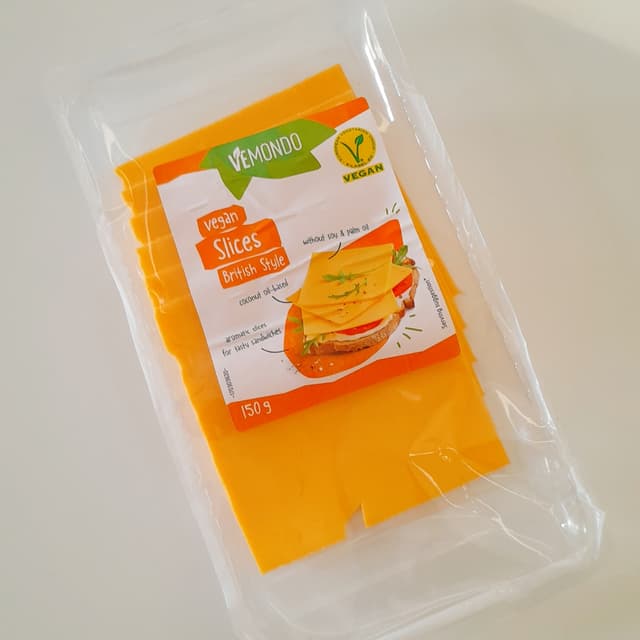 Cheese-style slices found during Lidl's July vegan promotion. Named "British style," to me the taste is somewhere between a mild cheddar and typical American cheese. They didn't melt too well on the chicken patty we prepared them on, but cold on a sandwich they work fine.