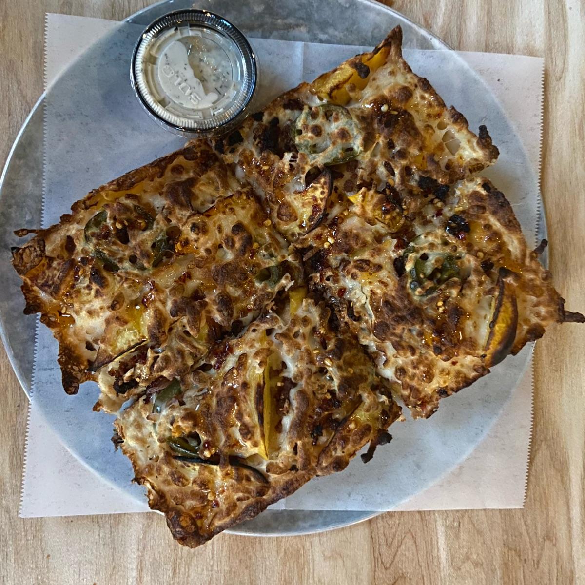 I highly recommend ordering this special if you enjoy peaches! It was delicious. 🍑 The hot honey drizzle is not hot, so don’t be discouraged if spicy isn’t your thing— it merely adds a sweetness with a small hint of chili pepper and will have you discreetly licking your fingers. 😆 This pizza is 100% vegan, and judging by the thinness of the ‘honey’, I think it’s made using agave.