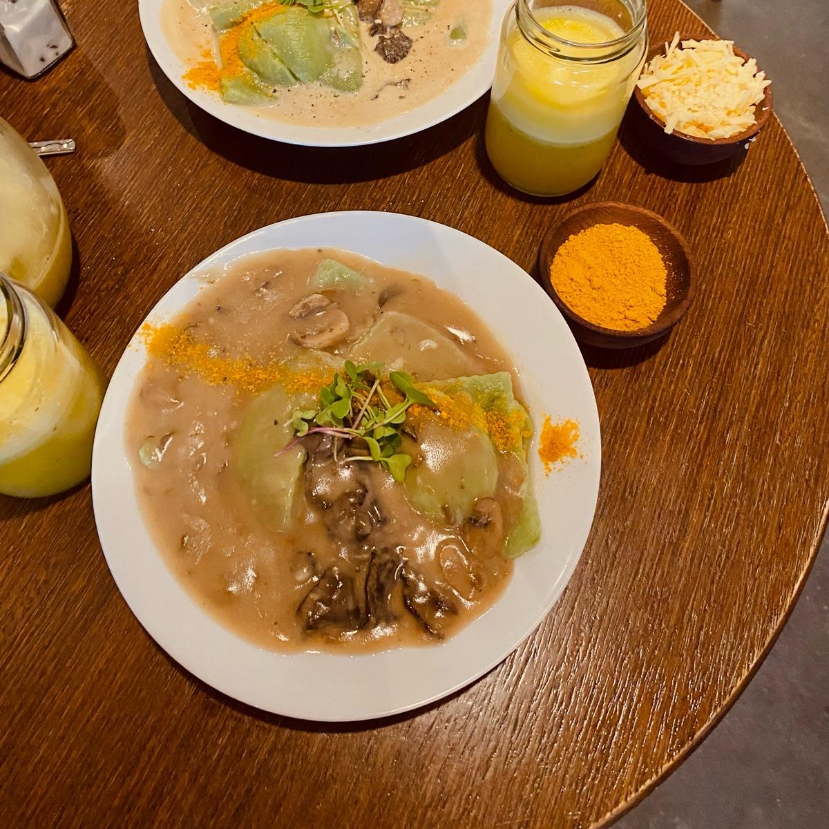 El mejor plato que tienen en mi opinión. Rellenos de quesofu, calabaza, cebolla caramelizada y nueces, con salsa de hongos.