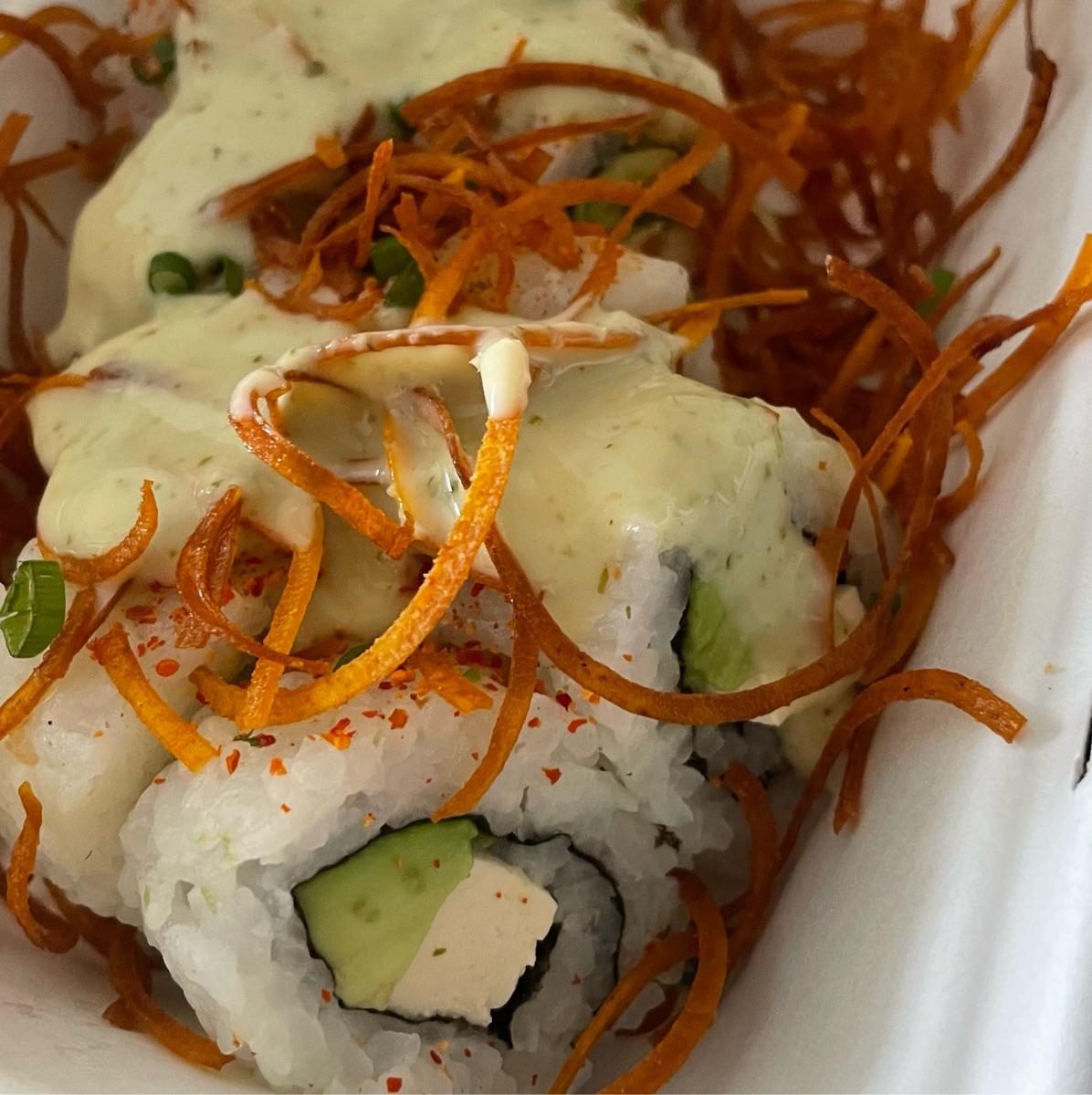 Relleno con palta y tofu, topping de hilos de camote y salsa acevichada.