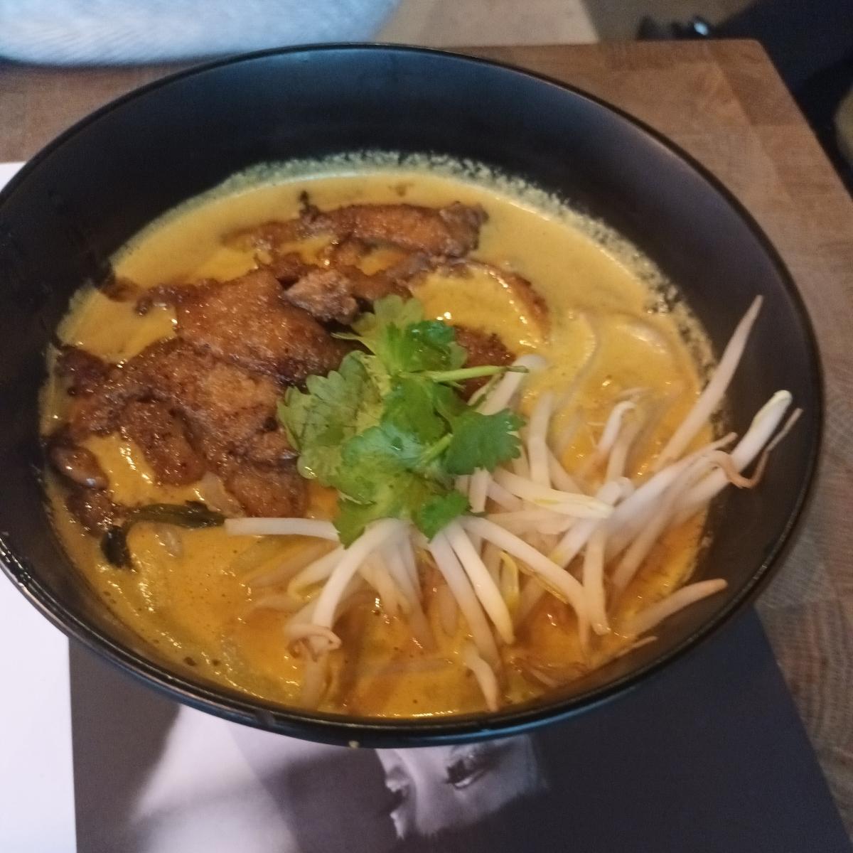 Muy rico y cremoso con la leche de coco, el no-pollo también muy conseguido