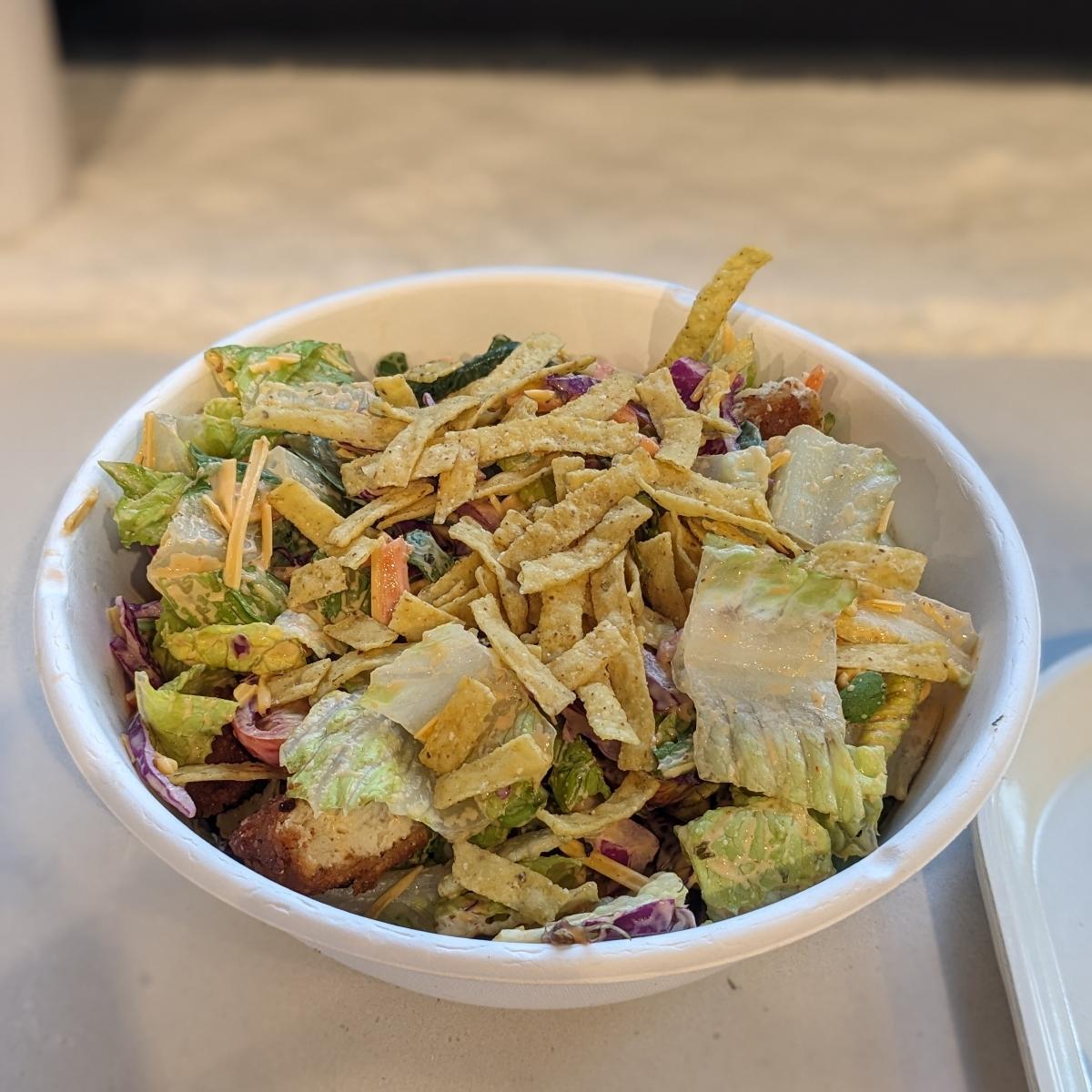 #salad #vegancheese #veganchicken #veganmeat #cheddar #chipotle #ranch #tomato #corn #tortillachips #eatyourveggies #eatyourgreens