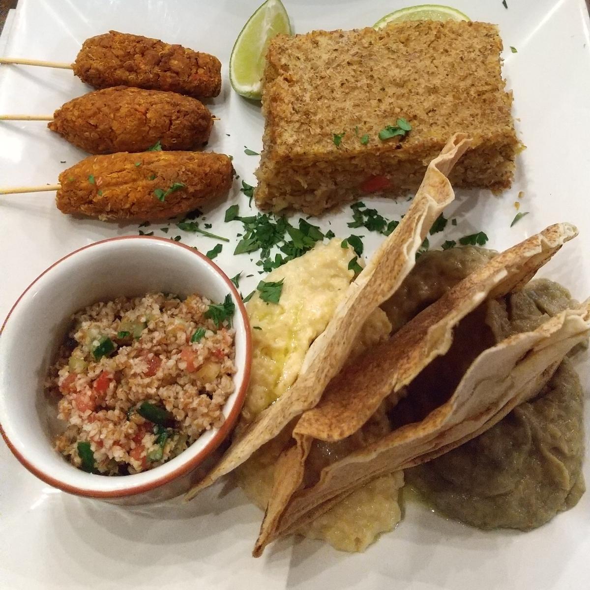 Hummus, babaganoush, tabule, quibe assado, kafta de carne vegetal e quinoa, pão sírio.