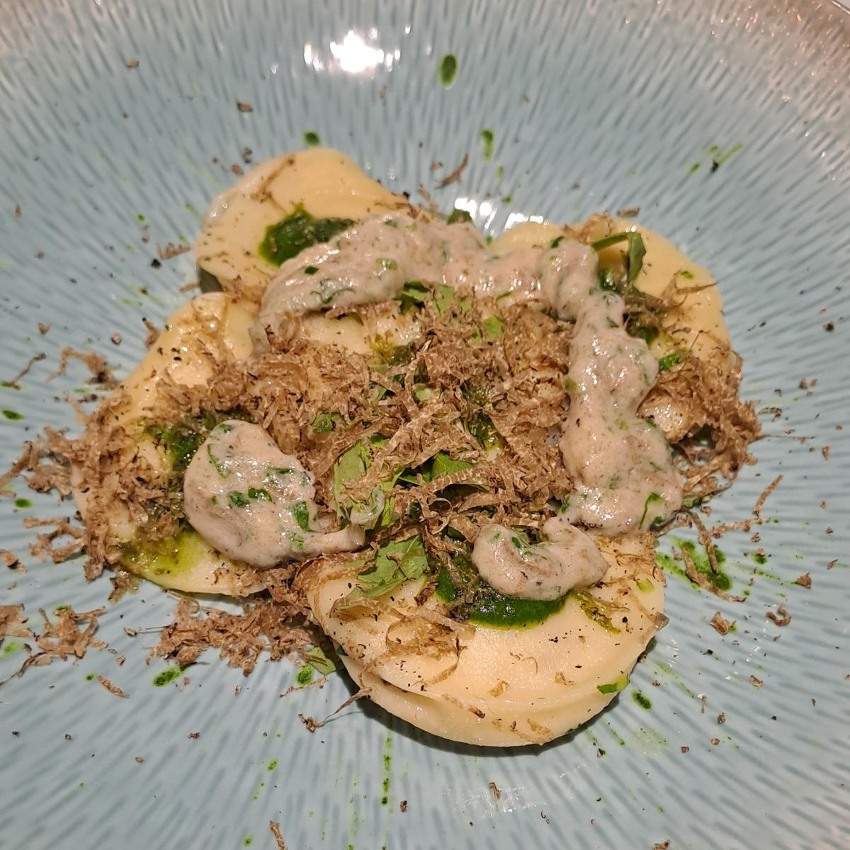 Piatto di ravioli con sfoglia fatta a mano e senza uova, ripieni di crema di mandorle, serviti con rucola e tartufo. Buonissimi. La dolcezza della mandorla è ben compensata dal gusto forte del tartufo. Apprezzato molto a tavola anche da non vegani