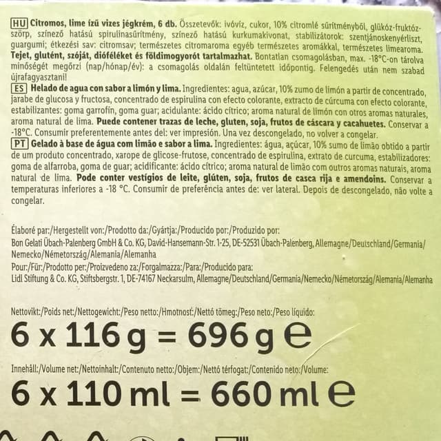 Helado de agua sabor lima limón. Sus ingredientes principales son agua, azúcar y 10% jugo de limón. Vienen 6 en la caja. Ricos, pero los helados de agua me revientan la boca, me produce una sensación muy desagradable en dientes y encías.
