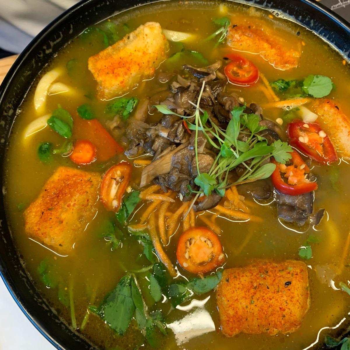 Amazing ramen! It comes with shichimi-coated silken tofu + udon noodles, a curried vegetable broth. topped with wok-fried mixed mushrooms, pea shoots, shredded carrots and a chilli + coriander garnish. It was very hot!!
