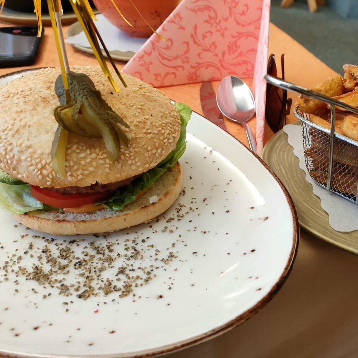 Tasty vegan Burger with a meat-like patty and wedges on the side. We especially liked the sauce.