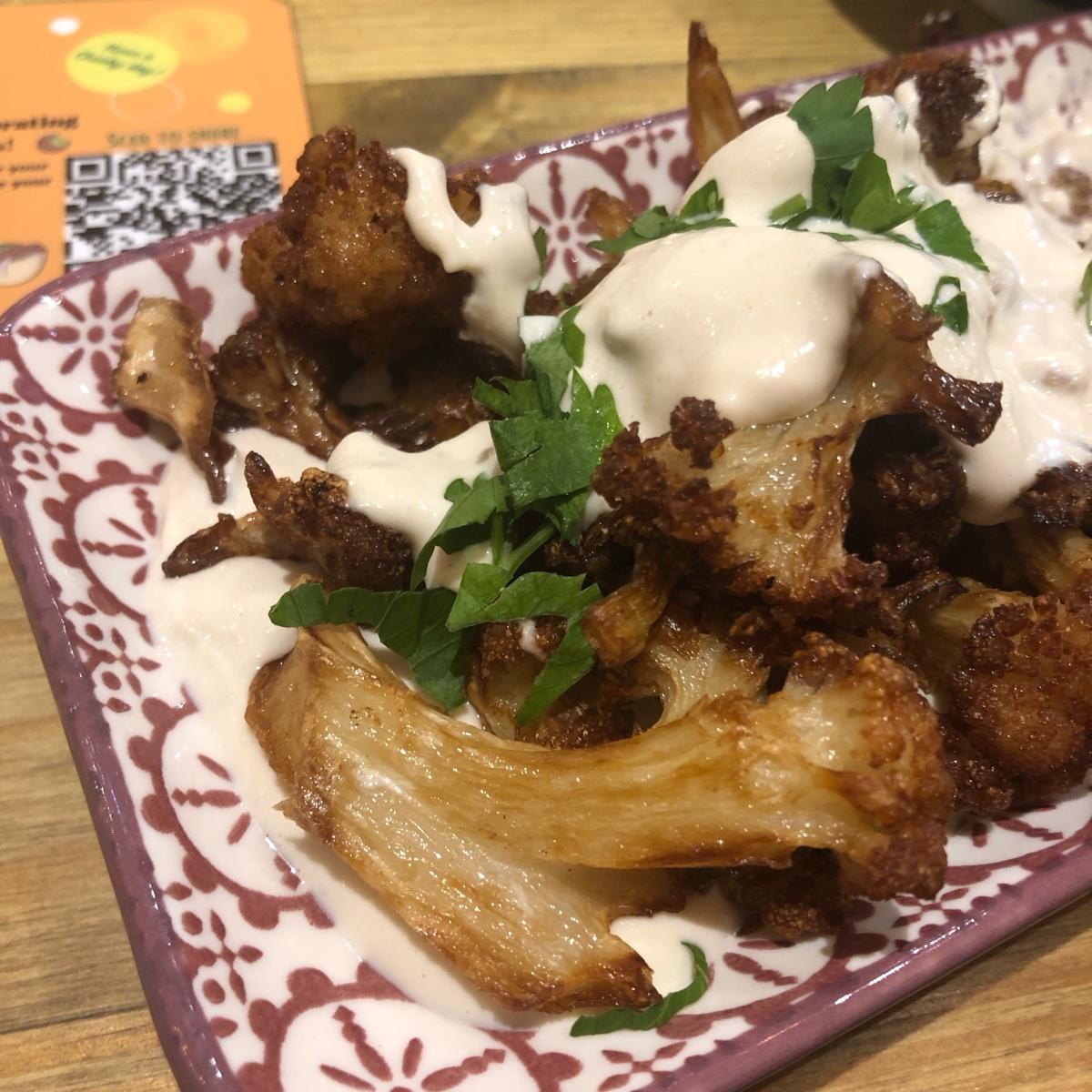 This is SO good. Melt-in-the-mouth soft fried cauliflower, with a slight dry herby coating and drizzled in tahini and herbs. Just so good.