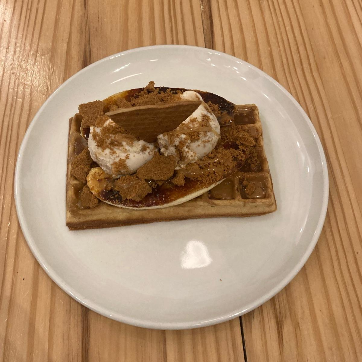 An exceptionally good waffle! 🧇 I am super impressed by how well balanced this dish is. With Biscoff ice cream, sauce and cookie pieces it could be a bit monotonous but not at all - each elements brings out a different texture and the Biscoff is nicely balanced with the delicious brûléed banana. The waffle is soft and decadent, the ice cream smooth and sweet and overall this is just a beautiful symphony of vegan goodness 🌱