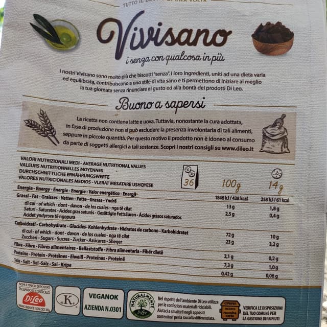 Un ottimo biscotto vegetale che non ha niente da invidiare ai biscotti non adatti ad una dieta vegana! Friabile ed equilibrato. Dolce, ma non stucchevole. Mi piacerebbe che anche le marche grandicelle si impegnassero di più, come la Di Leo, a fare prodotti del genere. Questo biscotto mi ha conquistata e, quando lo trovo, nei market ne faccio scorta! Ingredienti e valori in foto!
