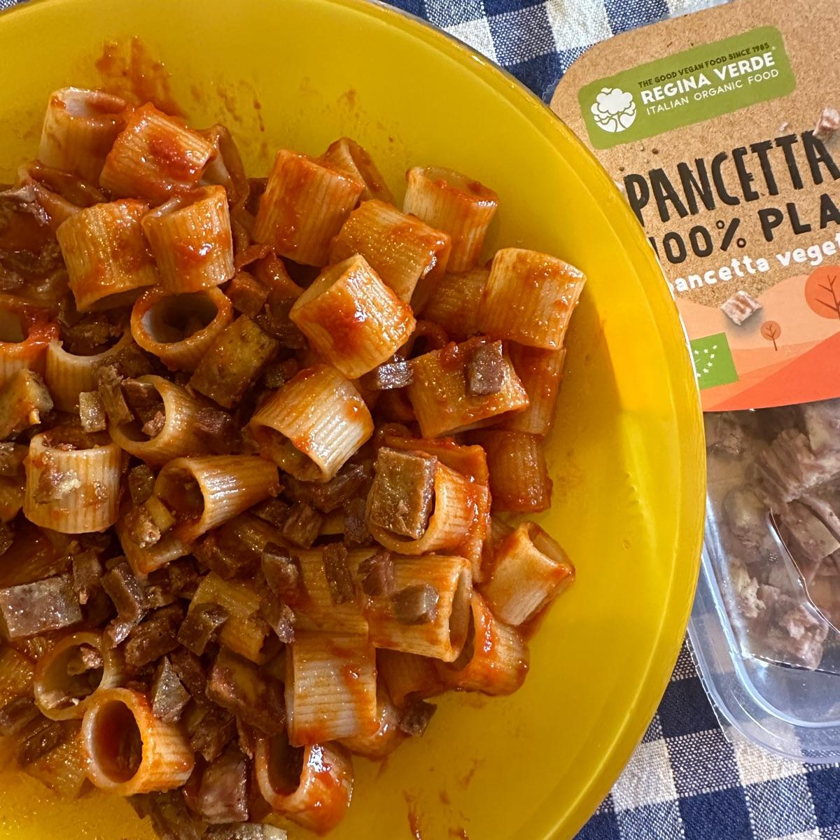 E che non te la fai una bella amatriciana con questa pancetta??? Certamente. Ed è venuta buonissima. Ho soffritto la pancetta a parte per poi unirla al sugo solo per l’impiattamento, così facendo è risultata bella croccante. Anche gli ingredienti sono buoni a base di tofu e glutine di frumento. L’ho assaggiata da cruda appena ho aperto il pacchetto e non mi era sembrata buona, mi sembrava troppo salata invece dopo la cottura e insieme al sugo mi è sembrata perfetta.