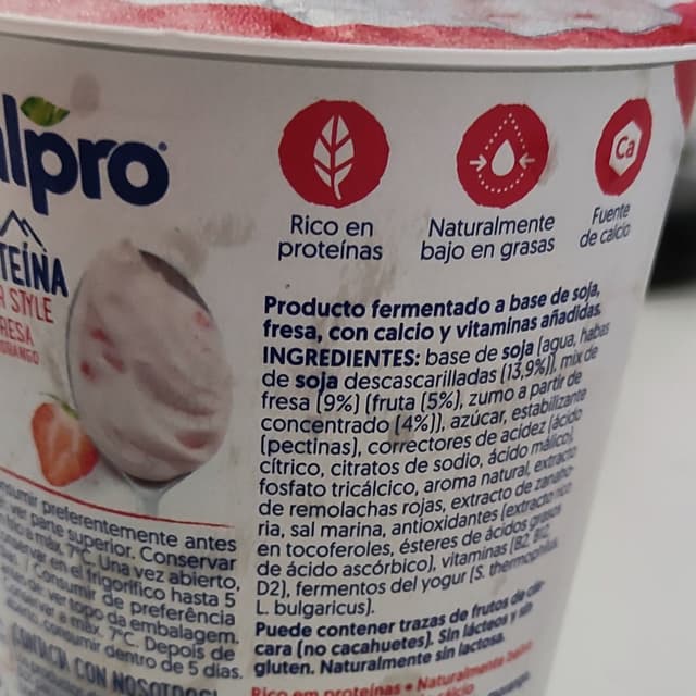Yogur proteico 100% vegetal, fermentado a base de soja.
