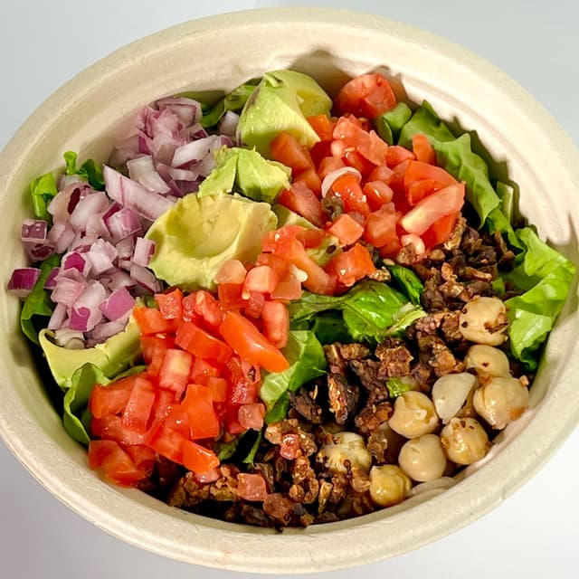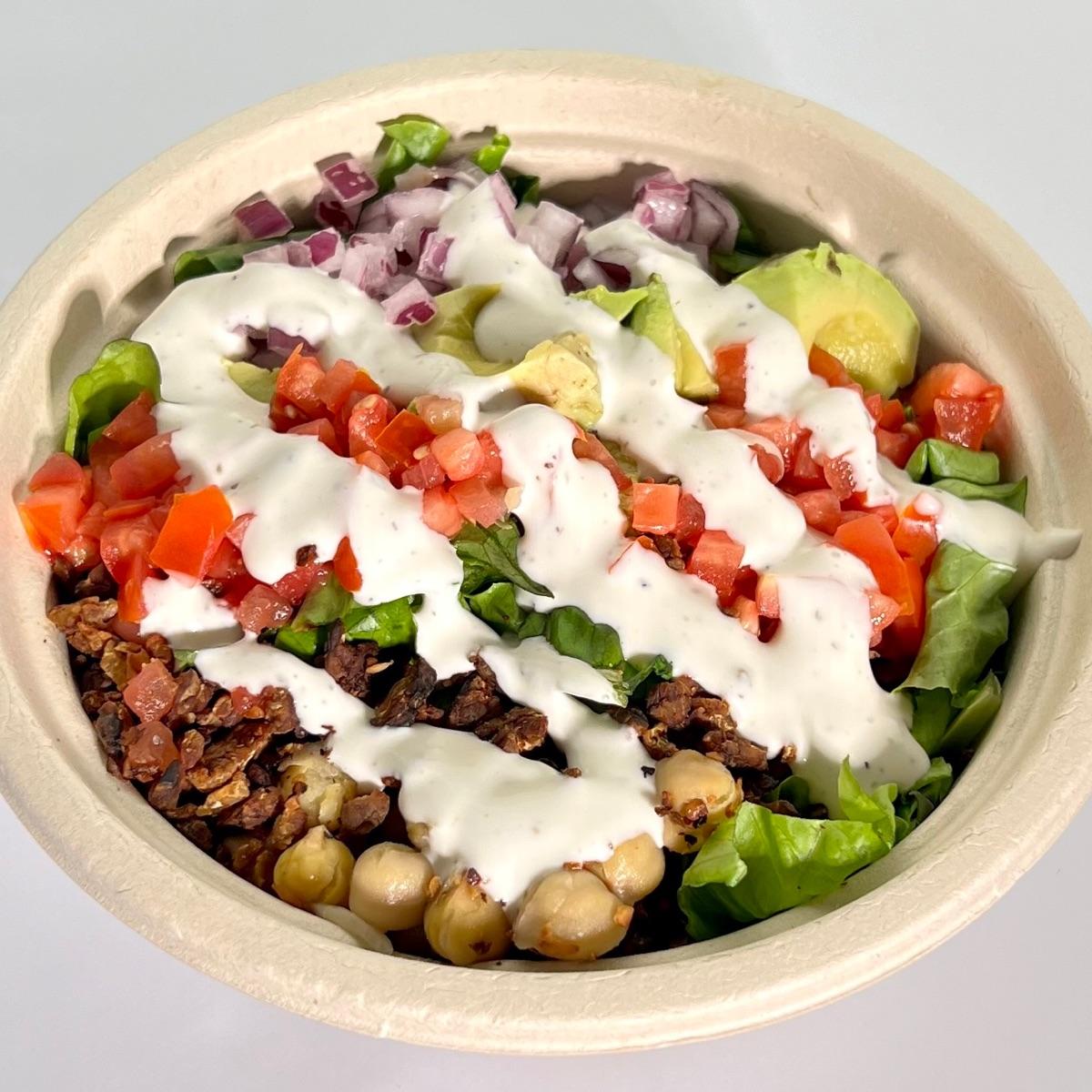 This consisted of smoky organic tempeh 🥓, organic avocado 🥑, organic chickpeas, organic tomato 🍅, and organic red onion on a bed of organic lettuce 🥬. Served with creamy, tangy, authentic-tasting vegan blue cheese dressing. Refreshing, satisfying, and great that all the veggies were organic.
