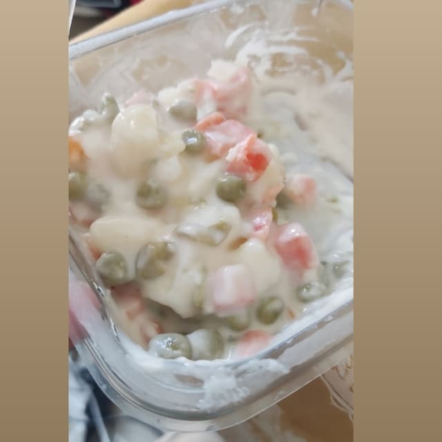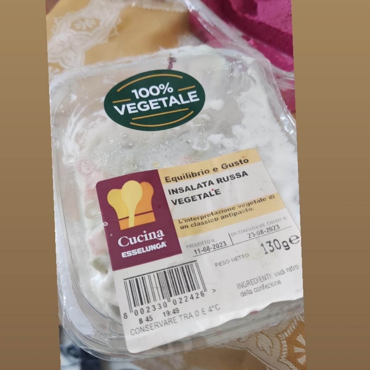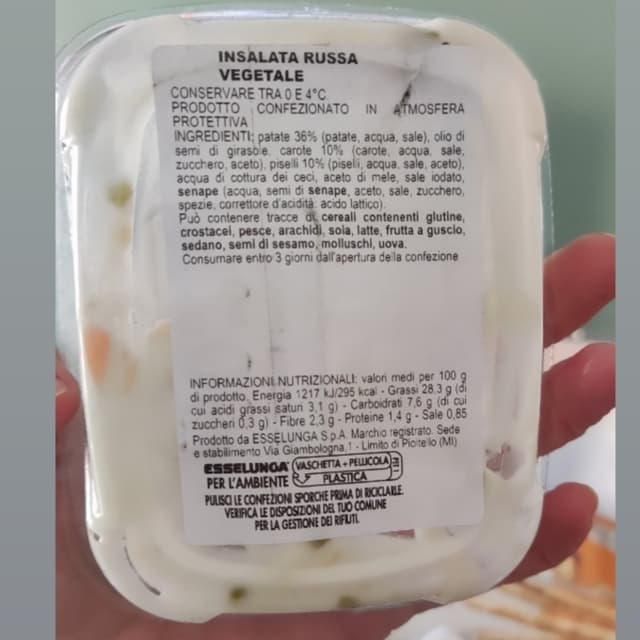 Dalla serie gli alimenti buoni già pronti dell'Esselunga che costano una cifra e che non fanno benissimo se mangiati quotidianamente 😅... Non poteva mancare l'insalata russa, credo che la maionese sia fatta con l'acqua di cottura dei ceci aceto di mele e senape, all'interno ci sono i piselli carote 10% e patate 36%.