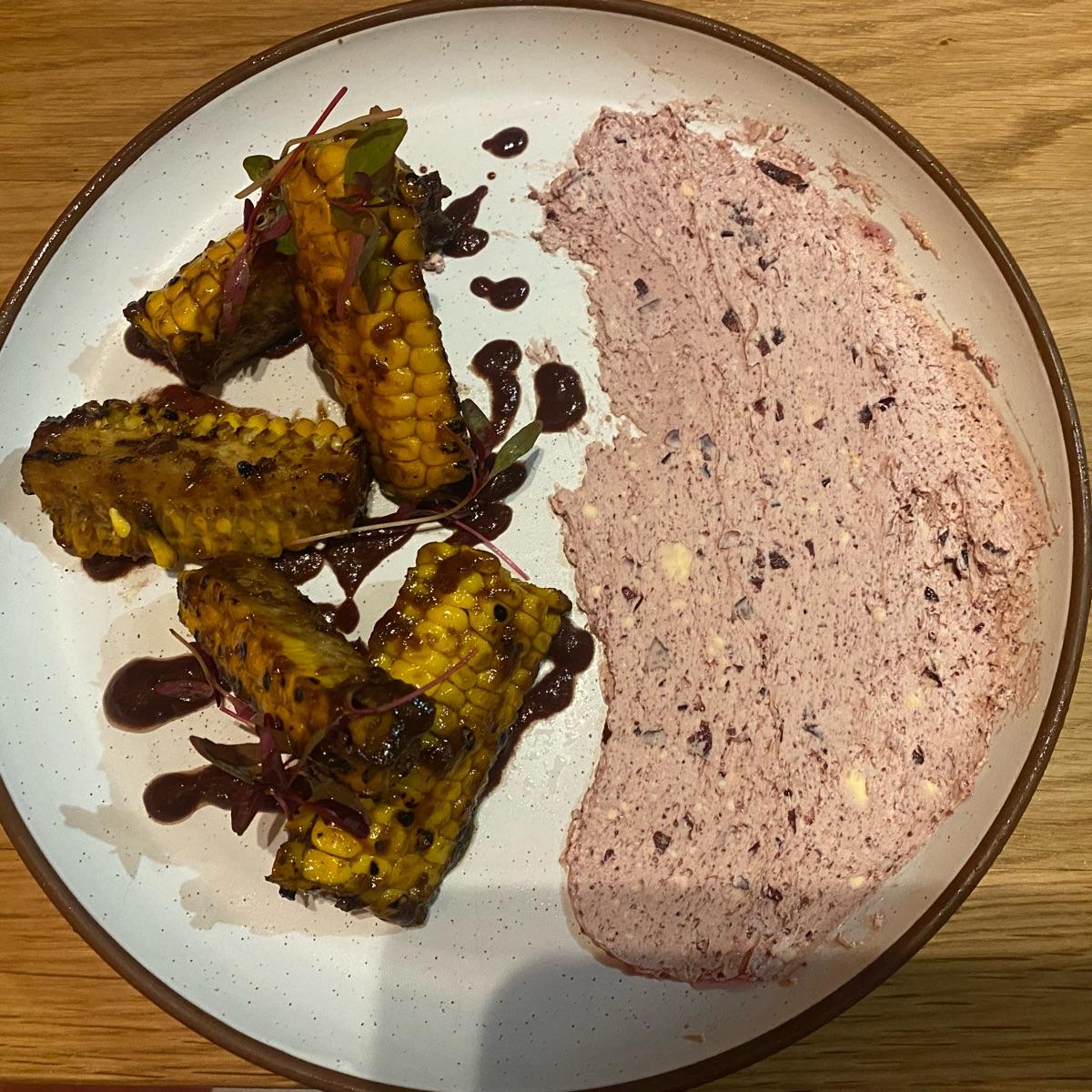 Sweet corn ribs tapenade butter and black olive balsamic, mini pannocchie alla piastra con questa crema balsamica hanno un sapore molto particolare ma super buone..