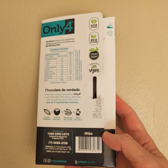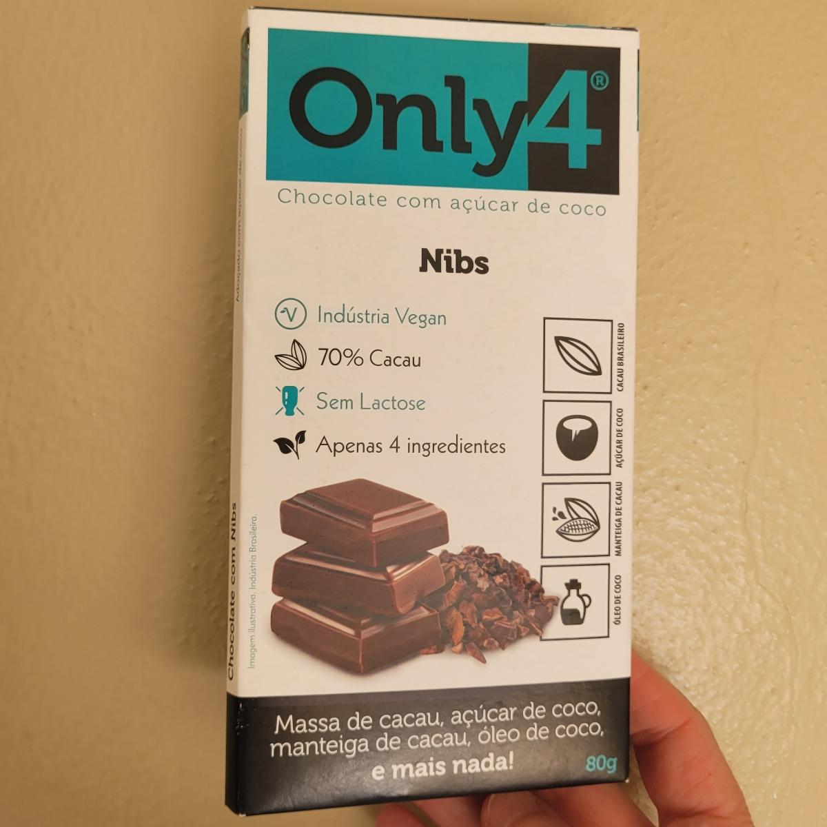 O chocolate da Only4 com nibs de cacau é muito gostoso e saudável! Os pedacinhos de nibs dão textura crocante ao chocolate, e deixam o sabor levemente menos doce do que o chocolate puro. Gostei muito!