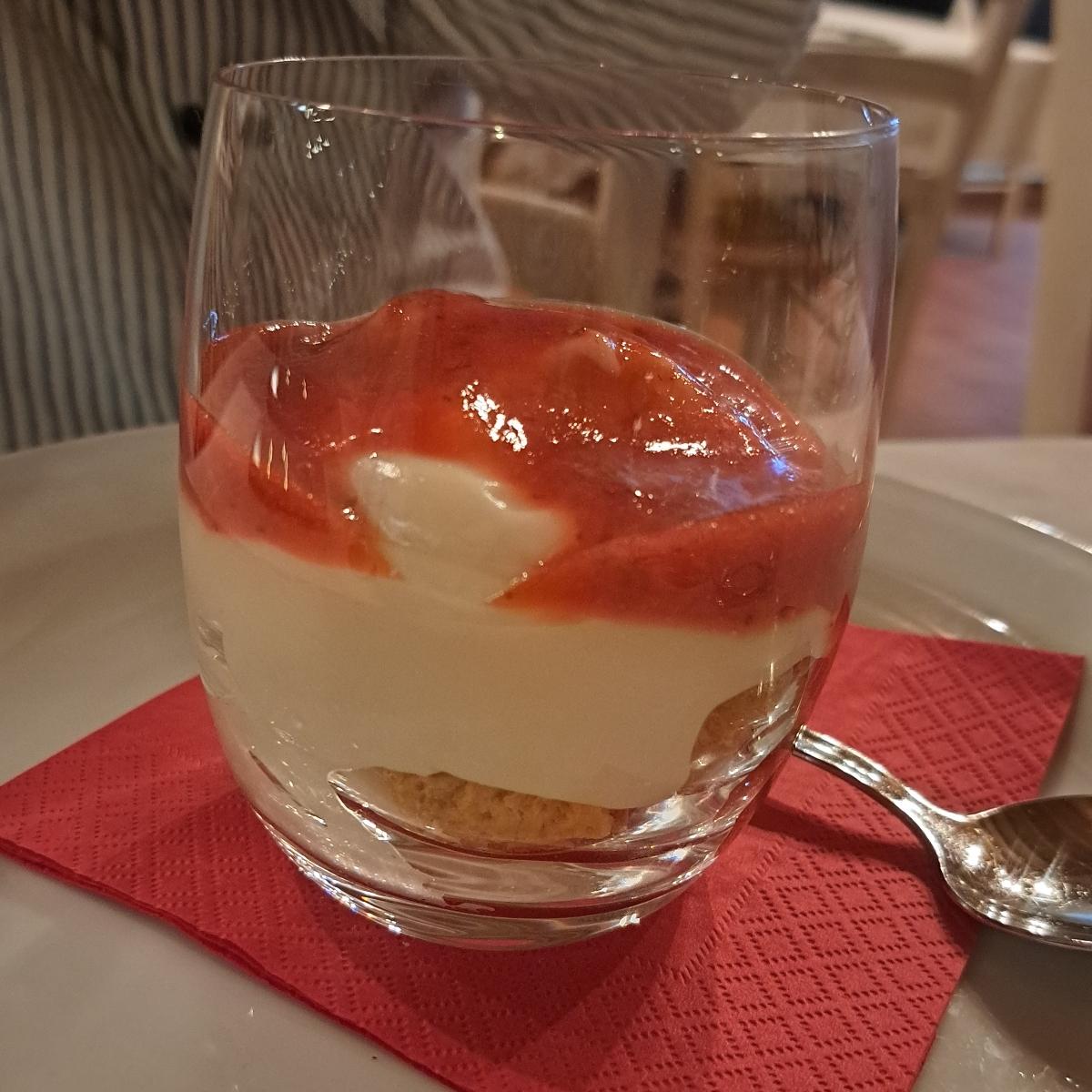 un piacevole fine pasto con base di frollini, crema vegetale e salsa alla fragola. fresco dolce da mangiare al cucchiaio, l'avrei preferito con uno strato inferiore più bricioloso e compatto (stile cheesecake) e magari la possibilità di cambiare topping.