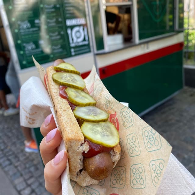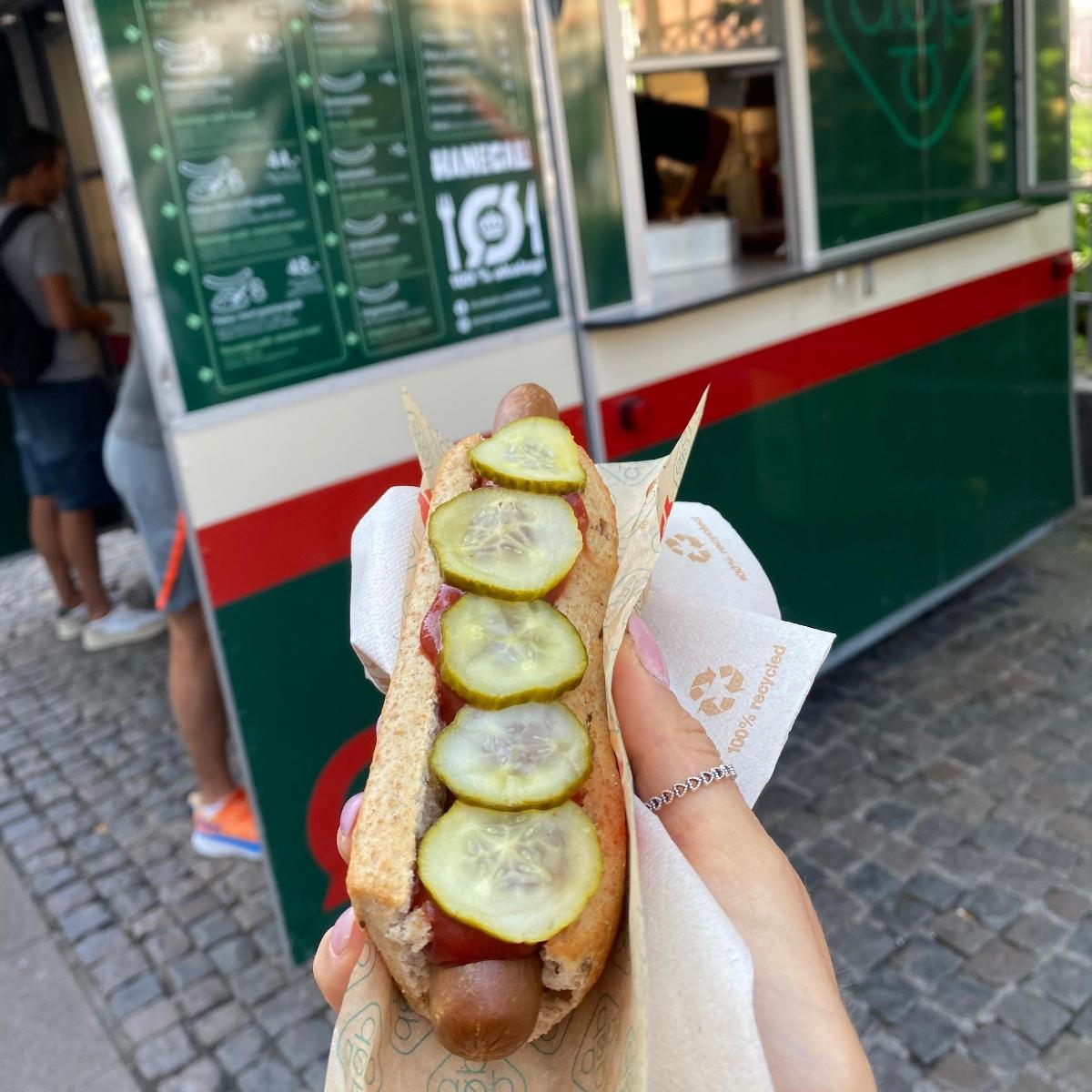 Food truck del tipico hot dog danese presente a in due punti al centro Copenaghen. Secondo me è una tappa da non perdere! La loro salsiccia vegetariana è anche vegana e viene proposta in pochi e semplici modi: nel tipico panino lungo tagliato a metà in stile hot dog , inserita nel panino "di lungo" e al piatto con contorno di purè e rapa rossa. La versione classica viene servito con ketchup, senape, remoulade (salsa tipica a base di maionese, senape, cetrioli e capperi quindi non vegana), cetrioli sott'aceto, cipolla cruda e cipolla fritta. Come topping ho optato per il ketchup e i cetrioli. Il sapore è davvero ottimo, un po' speziato ma nel complesso saporito. Perfetto per un pranzo veloce ed economico (visti i prezzi del posto!).