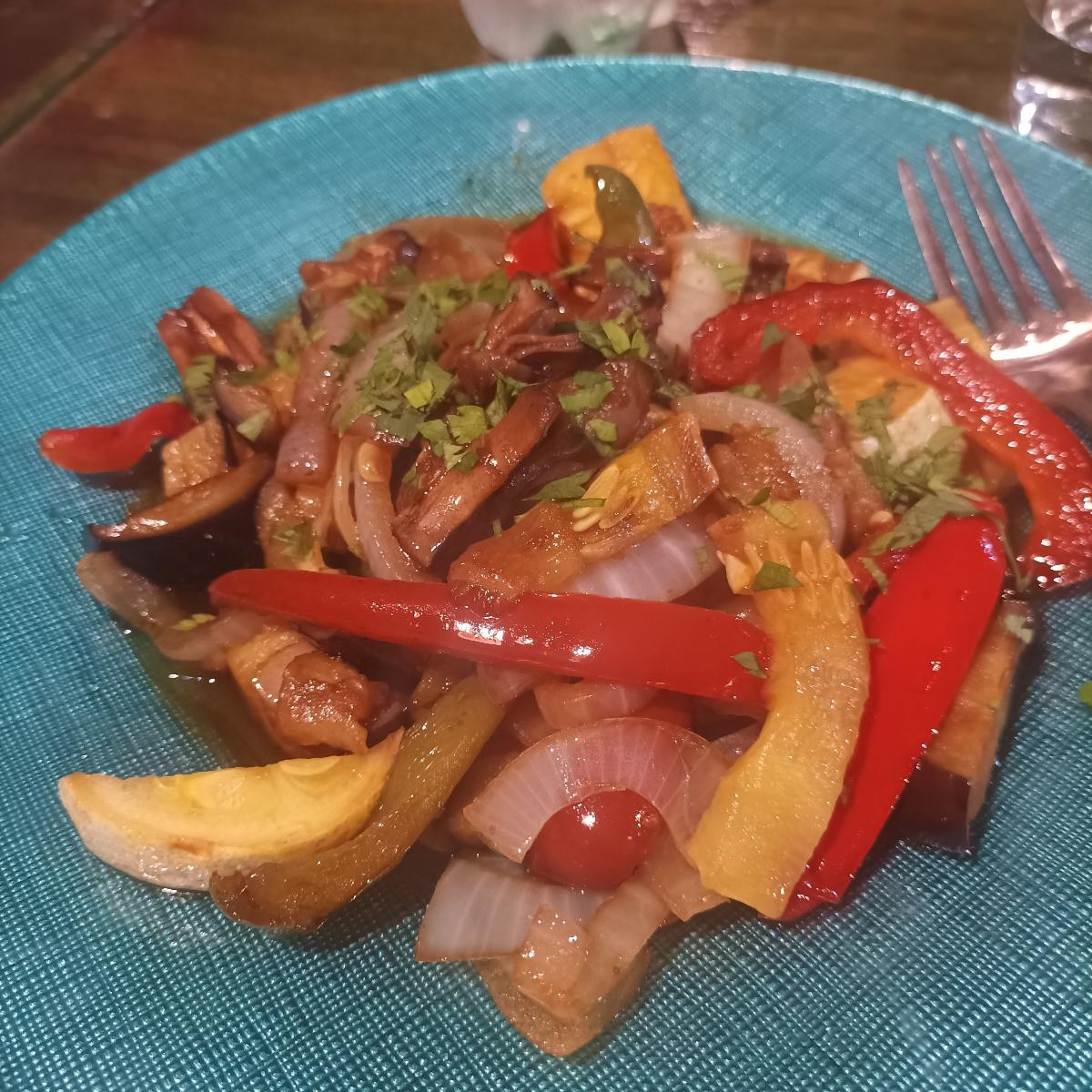Big dish of mixed cooked vegetables with soy sauce, mainly peppers, aubergines zucchini and onions! 🌶️🧅🫑🍆🥒 Simplex but tasty! #vegetables #mixedvegetables #veganwok #sauteedvegetables #eatyourveggies #verduresaltate