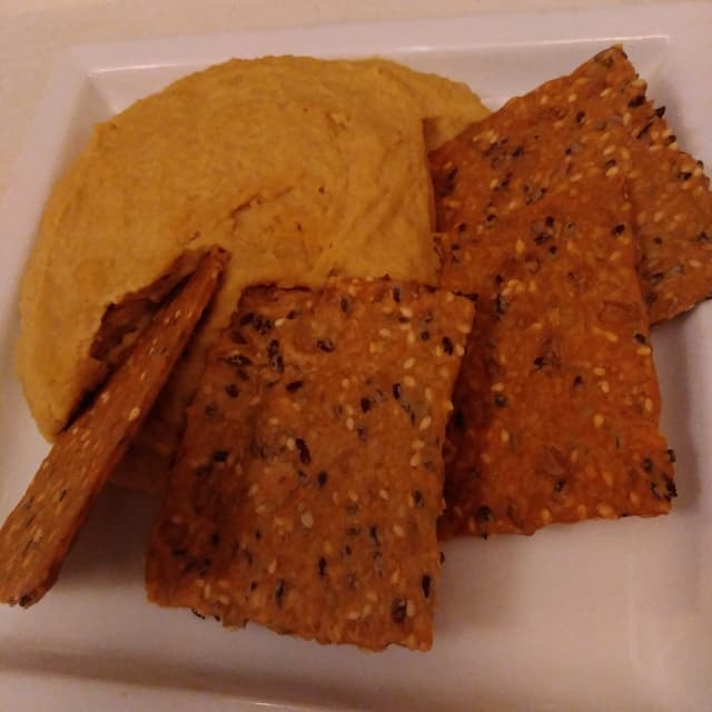 Hummus di ceci con craker ai semi. Ottima consistenza,si sente poco il gusto dell'aglio. I craker sono belli croccanti..tutto molto buono