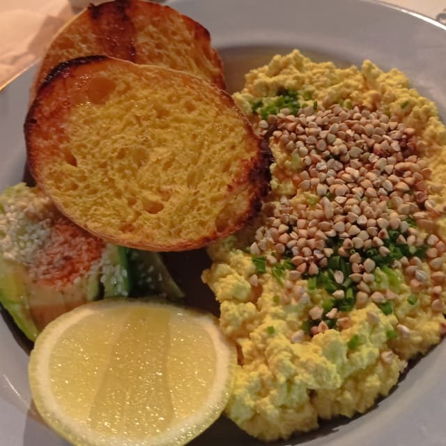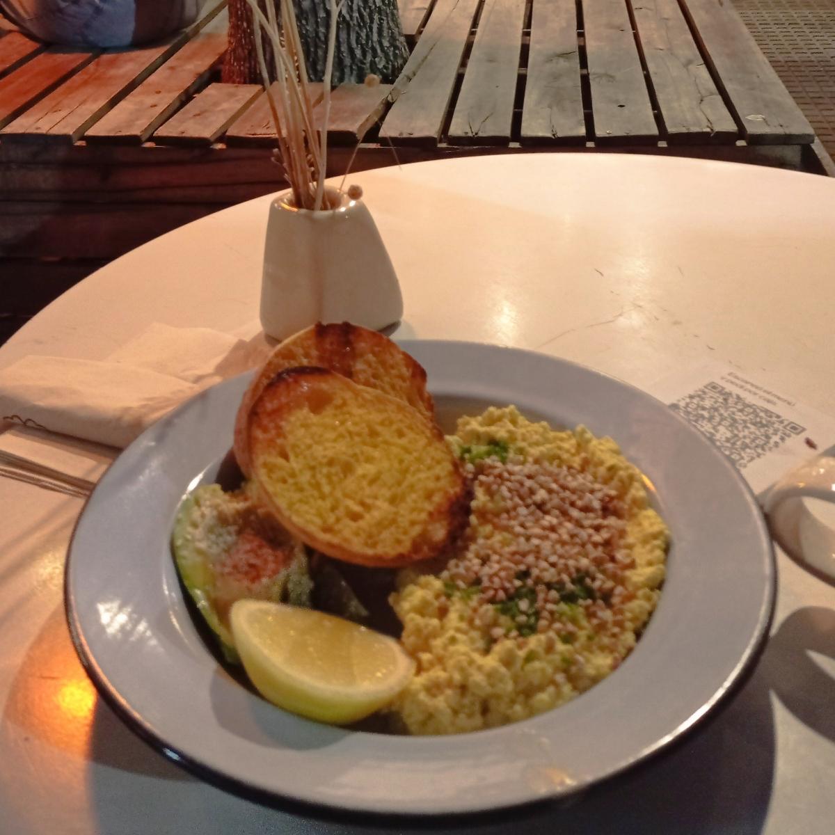 El revuelto de tofu no tenía gusto a nada. Posta NADA. El avocado era media palta ínfima de tamaño y lo único rico eran las dos tostadas de pan de cabutia que no tenían gusto de pan de calabaza 🎃