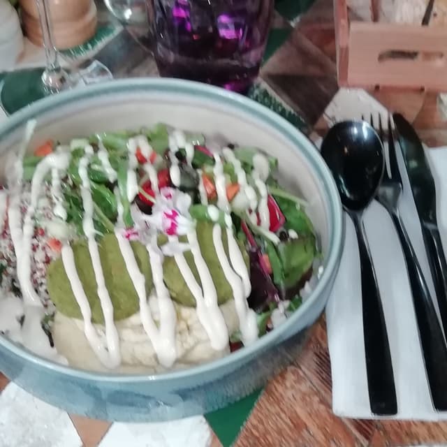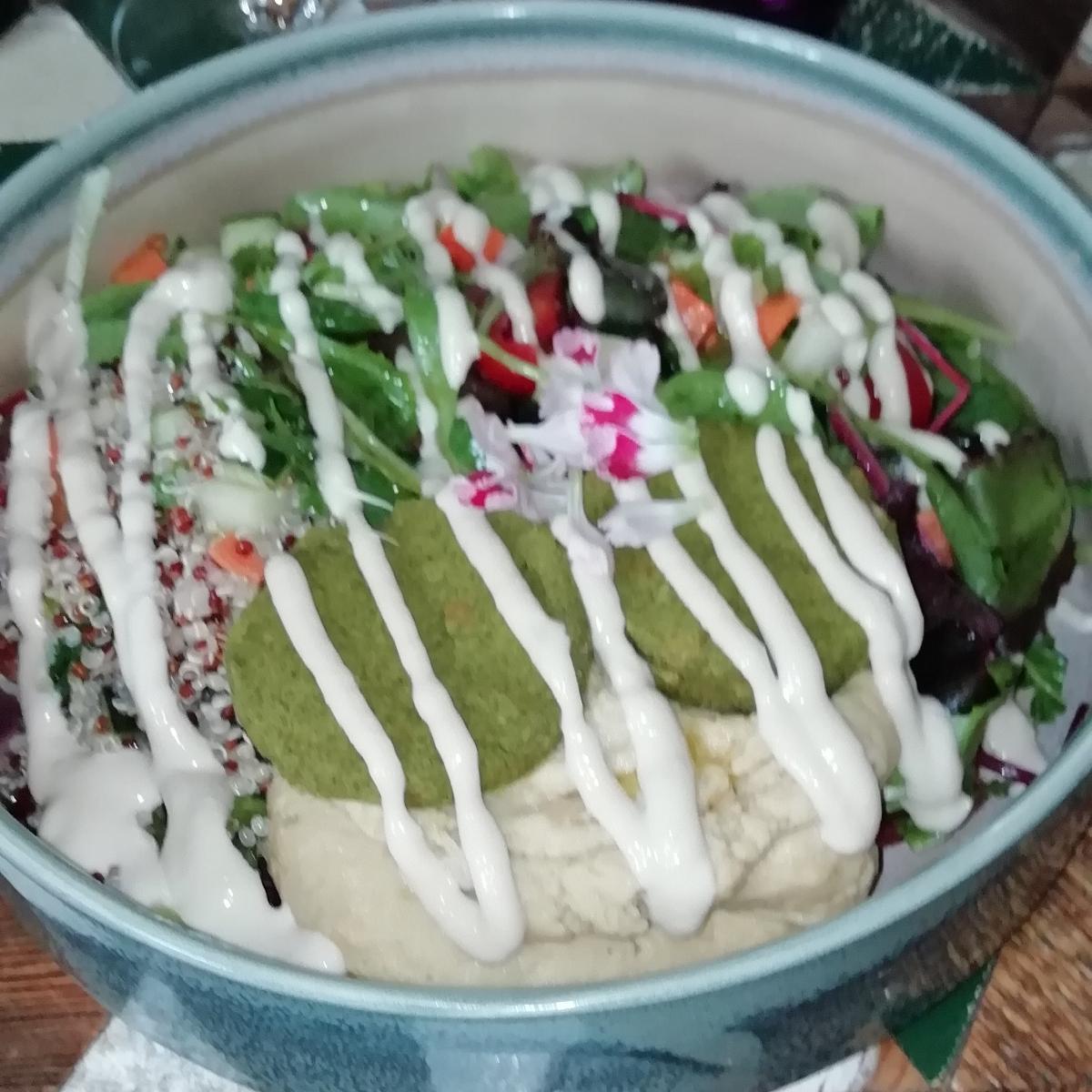 La Lebanese Bowl è composta di insalata mista, insalata di quinoa, hummus e falafel. Il topping è fatto di salsa di sesamo e limone.