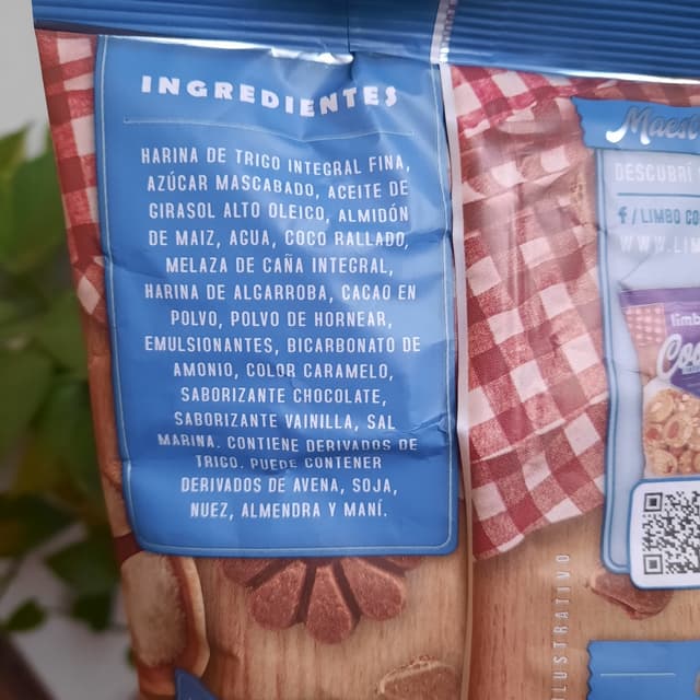 HARINA DE TRIGO INTEGRAL, AZÚCAR MASCABADO, ACEITE DE GIRASOL ALTO OLEICO, PASAS DE UVA, AVENA ARROLLADA, MANÍ EN LAMINAS, AGUA, MELAZA DE CAÑA INTEGRAL, ALMIDÓN DE MAIZ, POLVO DE HORNEAR, EMULSIONANTES,