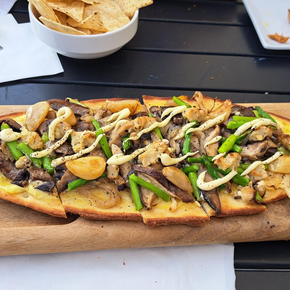It was described as "Rich & Earthy Flatbread topped with Herbed Goat Cheese, House-Smoked Wild Mushrooms, Roasted Garlic & Asparagus witha Black Truffle Crema."