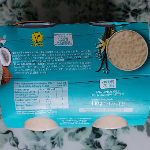 Der allerbeste Milchreis, den ich je hatte. Vor etwa 10 Jahren war meine erste "Begegnung" mit Milchreis, ein Dessert, das ich zuvor nicht kannte. Ich war sofort begeistert, doch die Idee, Milch zu konsumieren, war für mich schon damals ein heikles Thema. Ich bin noch nie auf die Idee gekommen, mir eine Portion mit pflanzlicher Milch zu kochen, was eigentlich sicher keine Zauberei wäre. Als ich vor kurzem einkaufen war und dieses Andros Produkt sah, wollte ich es sofort probieren. Das war eine echte Überraschung, da ich ja schon Fan von diesem Gericht war, jedoch noch nie eine solche leckere Variation entdeckt hatte, und dazu noch vegan! Einfach #sodelicious . Und das tollste dabei ist, dass Zucker nicht an erster Stelle in der Zutatenliste vorkommt, sondern erst nach Wasser, 16,9% Kokosnussextrakt aus Indonesien und 10,2% Camargue-Reis. Danach folgen: Stärke, natürliches Vanille-Aroma aus Madagaskar, Salz und erstaunlicherweise Gemüsekonzentrate, und zwar: Karotte, Kürbis und Apfel. Als Dekoration sollten noch welche Vanillesamen vorhanden sein, die ich aber nicht wirklich sehe. Das Produkt wird nicht als glutenfrei deklariert, da Spuren von Gluten enthalten sein könnten.