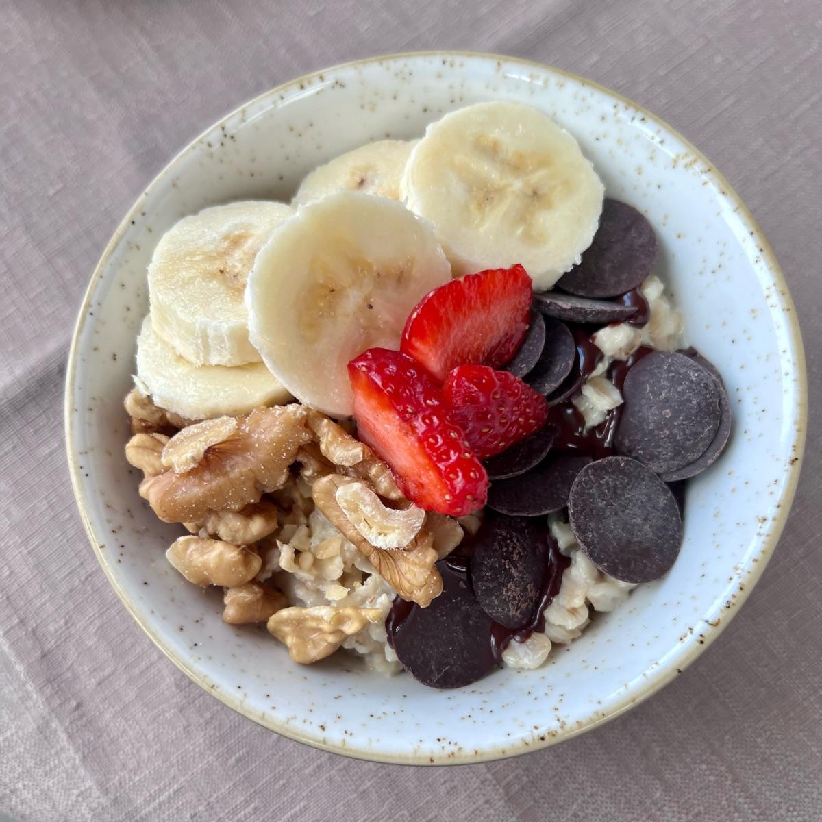 Porridge di avena con cioccolato fondente,banane,fragole e noci.