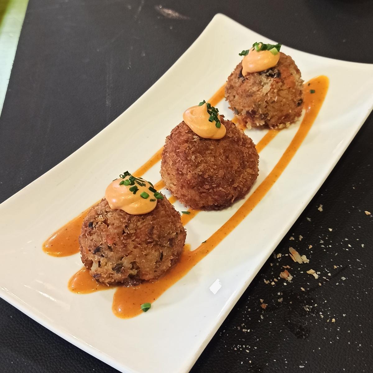 Flipando todo el rato con lo bueno que estaba todo lo que pedimos. Estas bolitas rellenas de arroz con verduras y serias estaban increíbles. Las salsas brutales, la textura también. No me explico cómo pueden hacer las bolas con el arroz tan sueltito dentro pero uf uf uf
