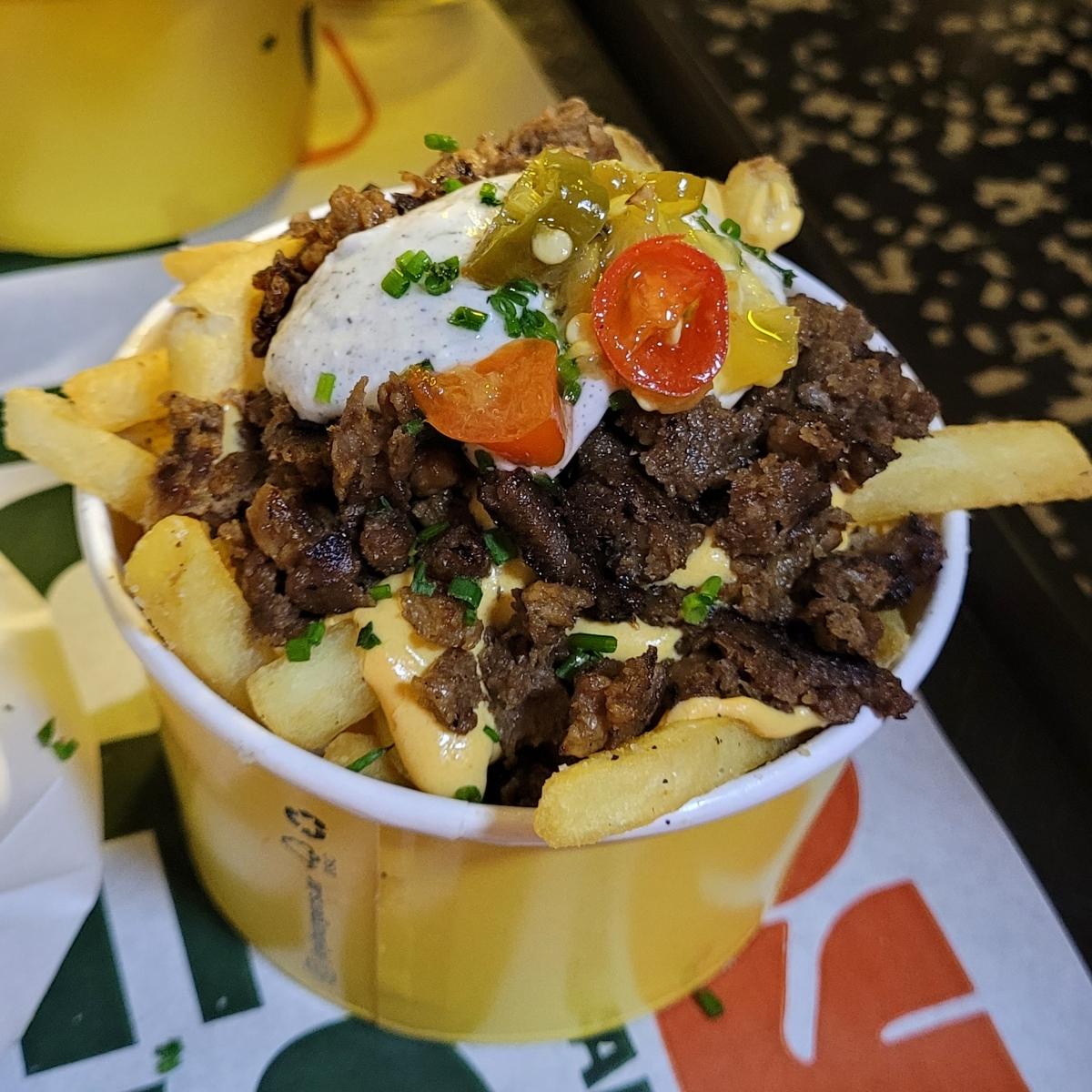 Las papas están siempre crocantes. El topping es de cheddar, queso agrio, "carne" picada y jalapeños. Un 10