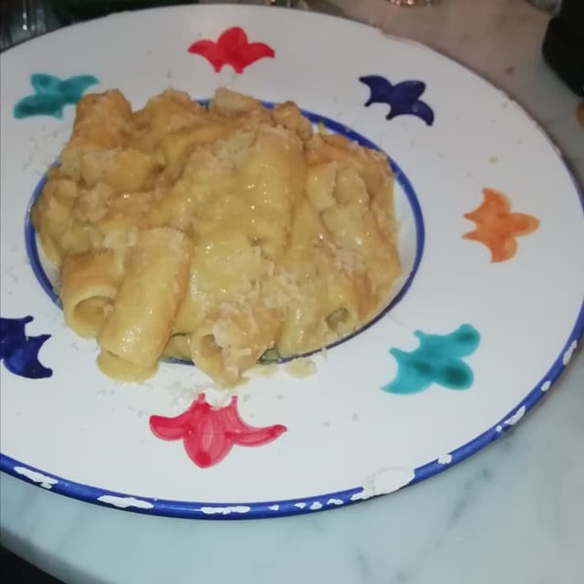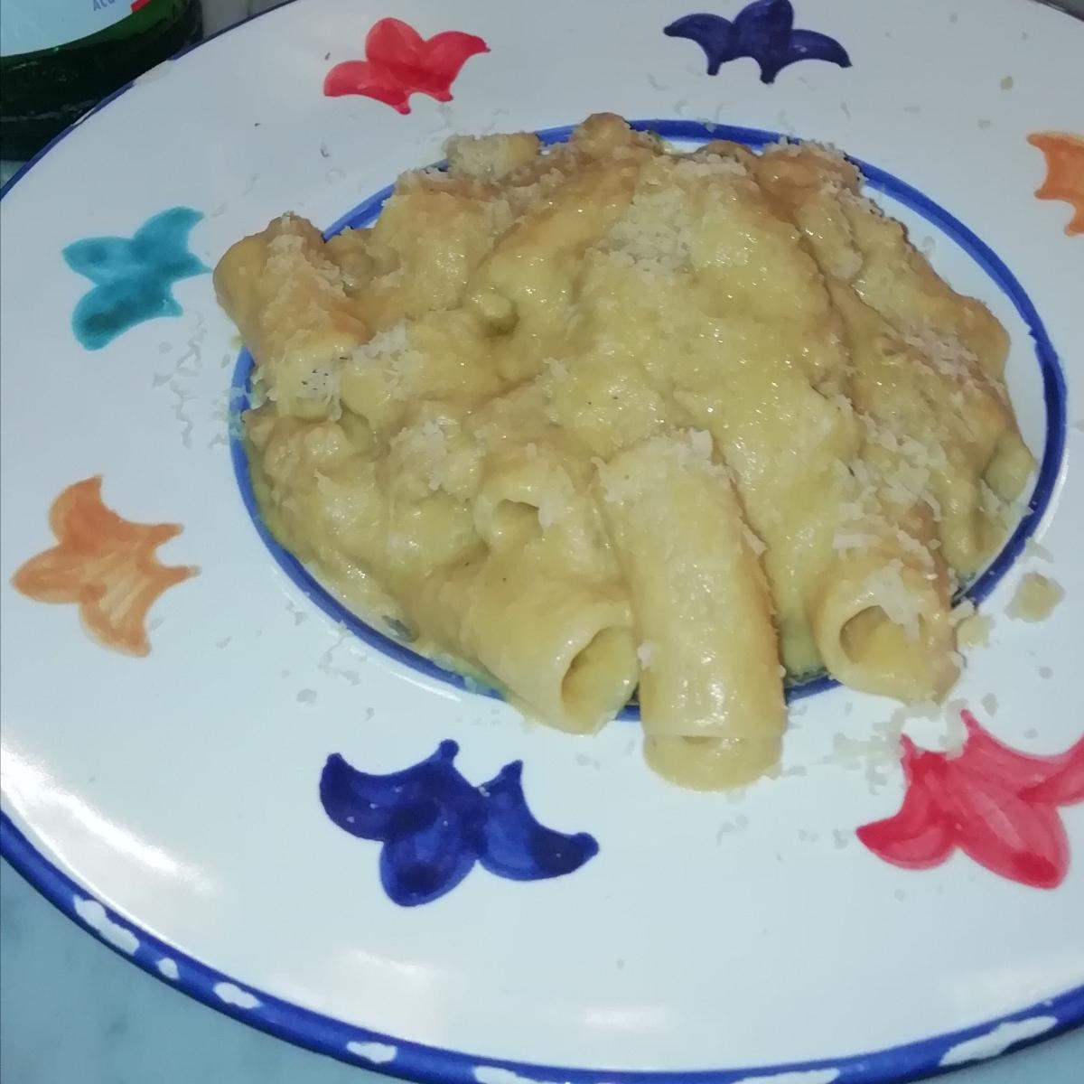 Rigatoni alla Carbonara veg con crema di carote e anacardi, seitan croccante, Gondino al pepe.