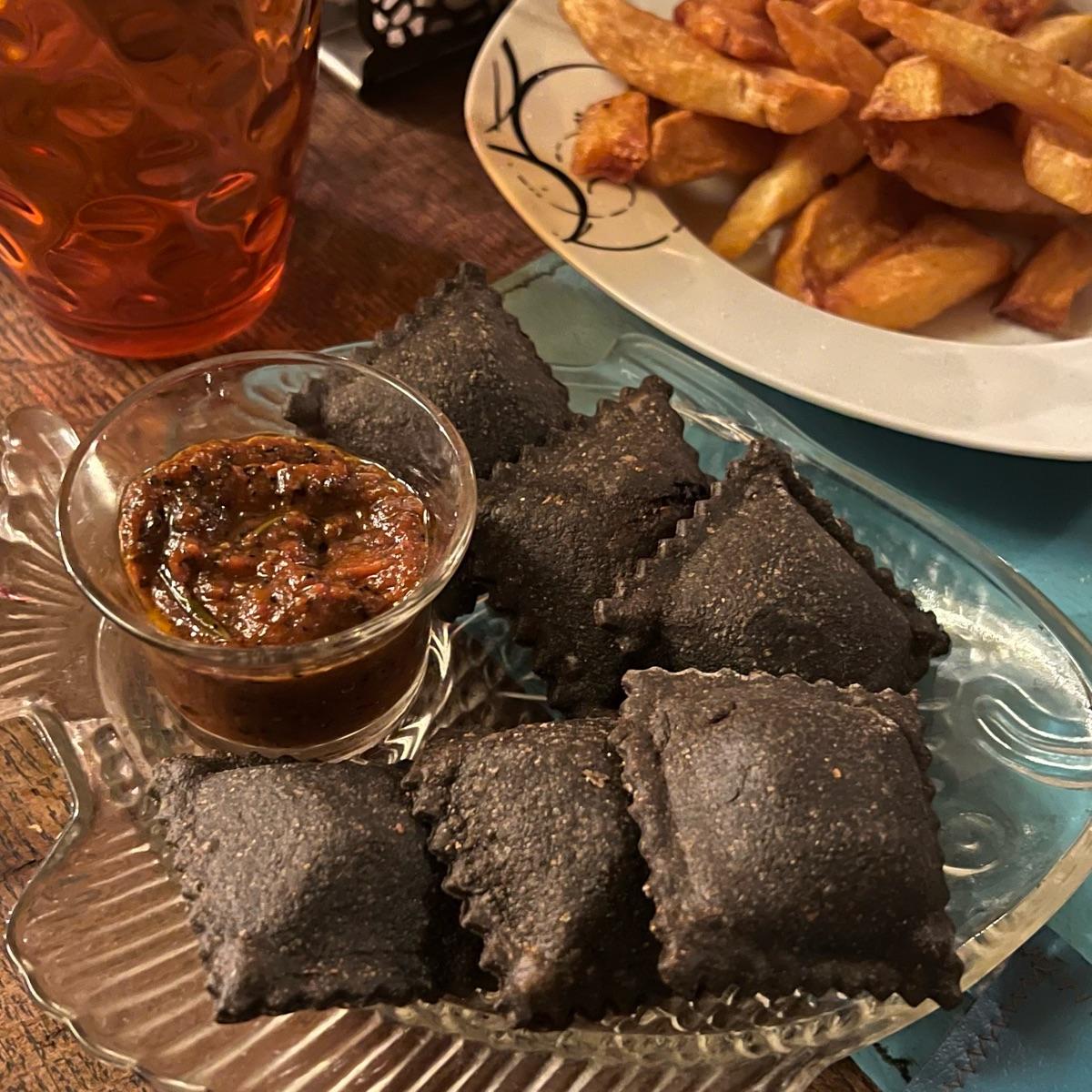 Estos ravioles con masa de carbón activado, son imperdibles !! (La salsita se va de tema)