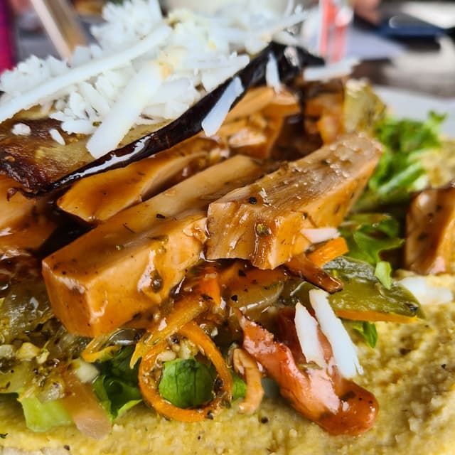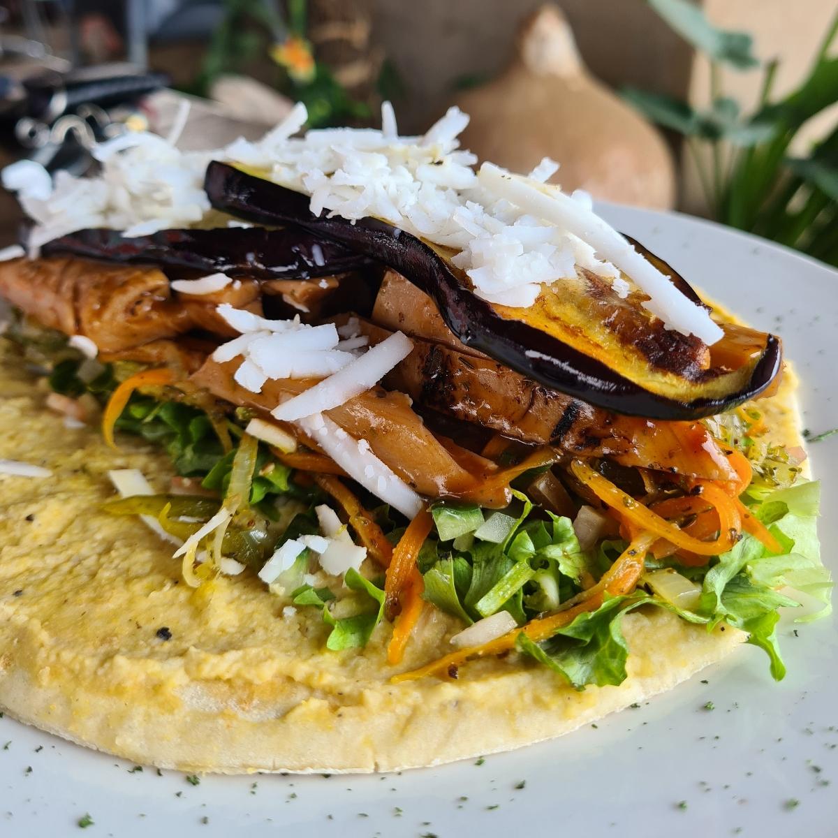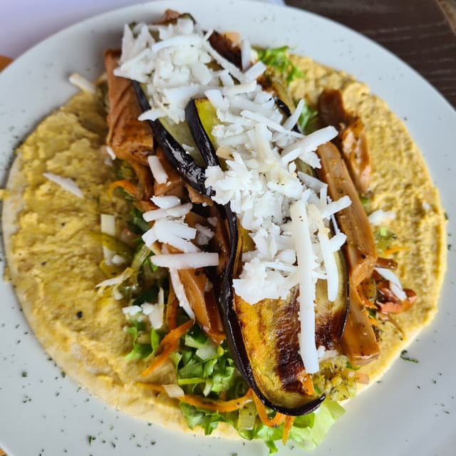 It was a #flatbread, more a crepe or tortilla, topped with #hummus, #lettuce, #cucumber, #carrots, #sweetpeppers, ch*ckenless strips (not crispy) and cargrilled #eggplant which was the star of the dish, this was really delicious. A plate full of good food, a huge portion.