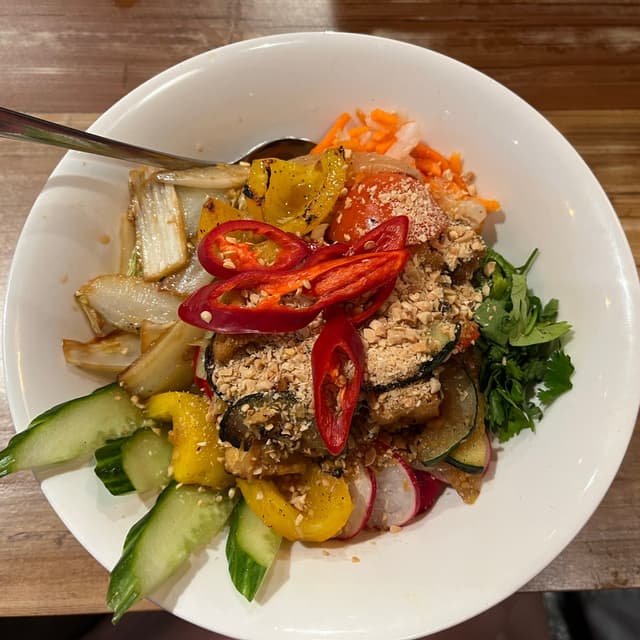 🇻🇳 Trying to make my way through their whole menu. This was very nice with a choice of broken 🍚rice or cauliflower rice with wok-fried 🇨🇳Chinese 🥬leaf, radish, 🥒cucumber & pickles, finished with 🥜peanuts, fresh 🪴herbs and 🌶️chillies. I chose the tofu and veg option. I’d happily get this again for £11.25. Love this place. It’s all so fresh, healthy and delicious. #vietnamese #veganvietnamese #rice
