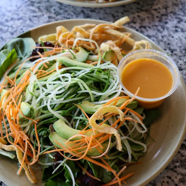 This was super refreshing as it was such a hot day. This had super fresh salad greens, spiral zuhcinni, carrot 🥕 avocado 🥑 and fried rice noodles. The ginger dressing is also #vegan. I really enjoyed this salad. It ended up being a great meal!