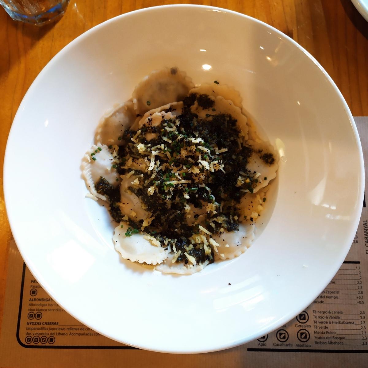 Lleva pasta fresca rellena de cremoso de setas y trufas, aceite de salvia y queso parmesano.