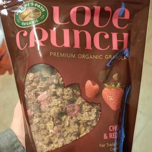 Amazing vegan granola! The granola bits themselves live up to the brands name with a nice crunch. They're larger chunks of granola. The chocolate is fair trade and delicious, with little bits scattered about. The berries are most scarce, but they are soft bits and flavorful. I'm not sure if they're dehydrated or how they're prepared, but I was surprised at their soft texture. Overall, I definitely recommend this granola. It's great on yogurt or on its own as a trail mix type snack.