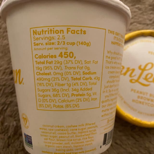 This nondairy frozen dessert may be the richest one on the market! Total fat 29 g saturated fat 19 g and 36 g sugar per 2/3 cup serving but you know what, it’s so worth it because for an occasional pleasure, it is divine. 5G protein per serving… ! HIGHLY RECOMMEND 😋