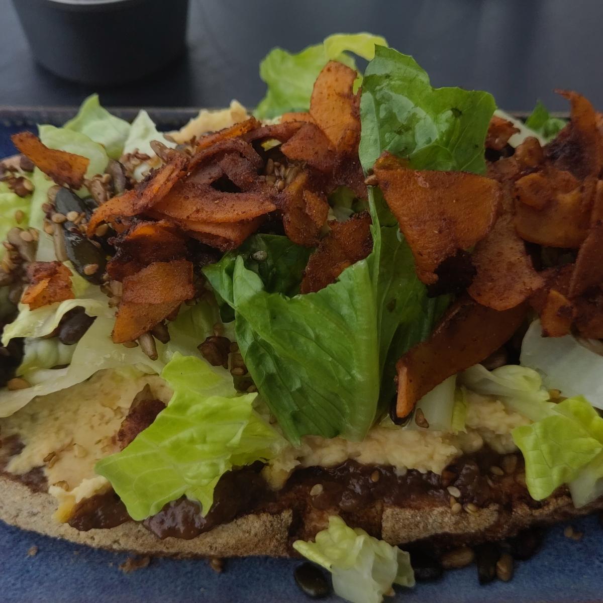 Delicious sour dough toast, with spiced seeds, hummus, lettuce and raisin chutney. I added the coconut bacon as well which was a great addition. Great that it is organic as well.