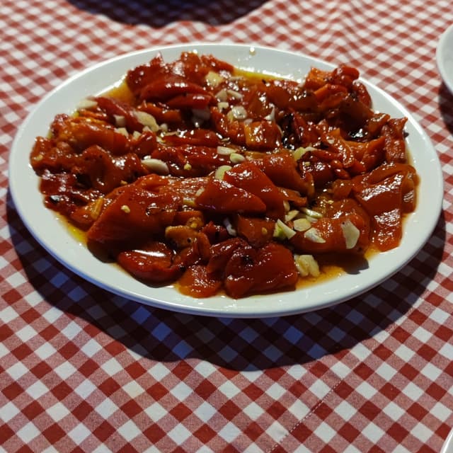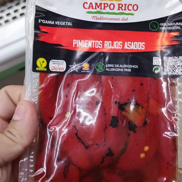 Pues también se encuentranesta bandeja de pimientos rojo, y la he puesto con un poquito de aceite de oliva y ajo.